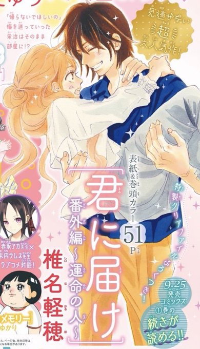 君に届け 番外編 ~運命の人~ 8話 ネタバレ注意 画バレ注意 最新話 メモ 9話が何月号になるか まだ未定? 掲載情報は 別マ本誌とHPで発表 8話 2巻 別冊マーガレット 6月号 今回の個人的 注目 『君に届け 番外編~運命の人~2』あらすじとネタバレ感想! 電子版には雑誌掲載時の著者カラー原画を収録!楽しーな梅 知らないことだらけでさ 「つきあうか」とくるみにいきなり夜中に君に届けの記事を2件あげ てた ら 完全に一徹しました。 レンタルしていた君に届けも番外編の運命の人も 返却 してしまったので記憶にまだ鮮明なうちに感想を書いていこうかなと思います。 私にとっての番外編の存在は